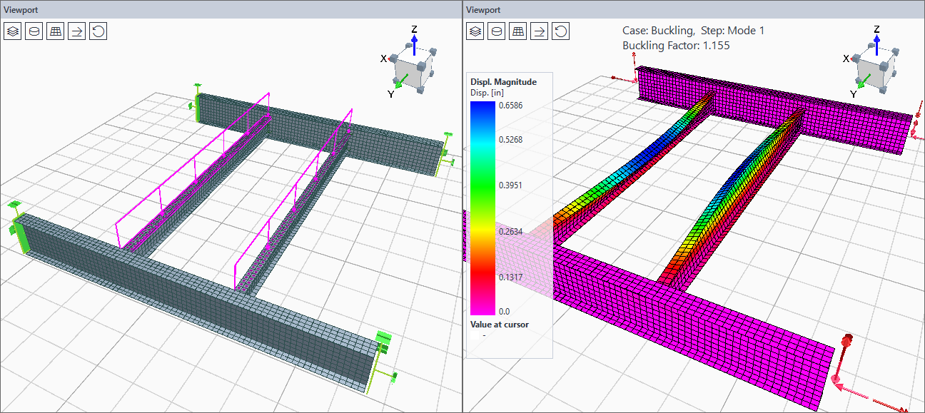 A análise de encurvadura de perfis metálicos, baseada no Método dos Elementos Finitos (MEF), está agora disponível através do plugin integrado BucklingFEM. Os elementos de pórticos metálicos podem ser convertidos em modelos de elementos finitos detalhados para uma análise de encurvadura por valores próprios. Este método permite capturar os modos de encurvadura globais e locais, proporcionando uma avaliação mais realista da estabilidade dos elementos estruturais em comparação com as verificações simplificadas tradicionais. Esta funcionalidade está limitada ao nível de licenciamento Ultimate.